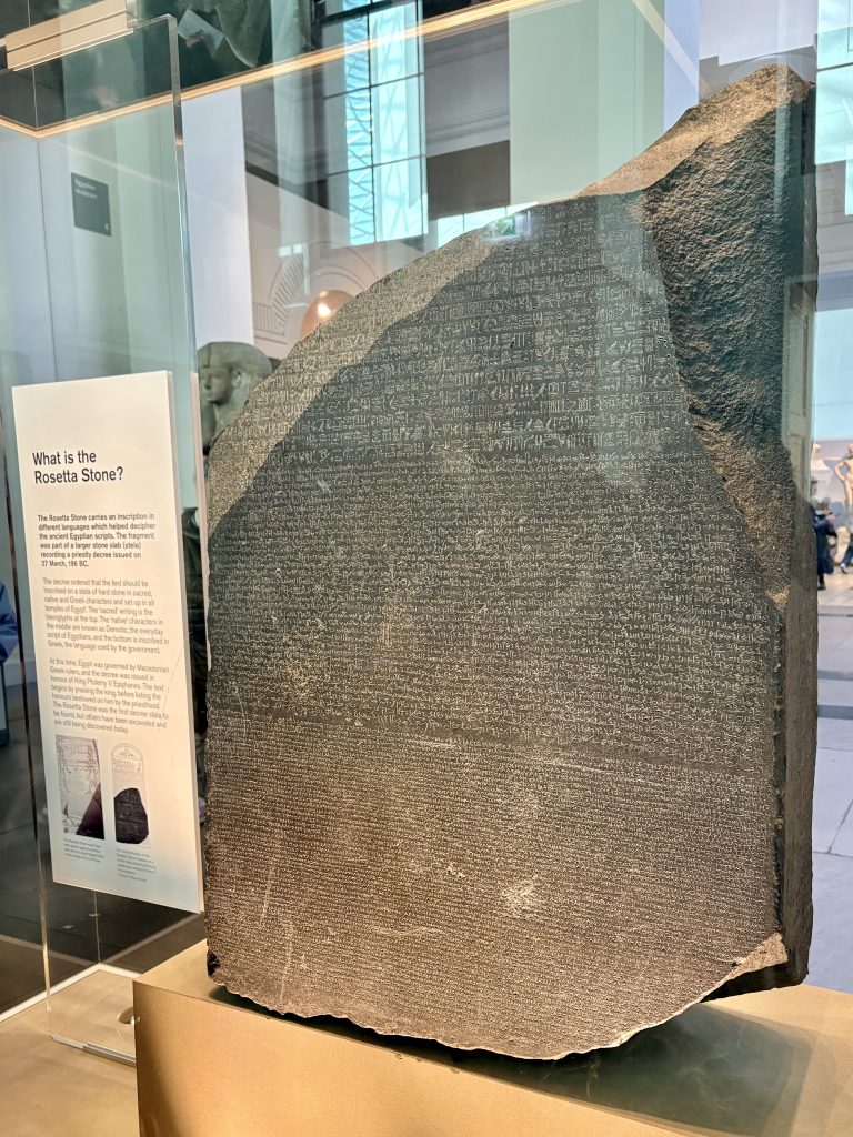 I detta flaggskepp för alla Britiska museum har man samlat mänsklighetens historia. Från förhistoriska fynd från tidig stenålder, via afrikanska kungar, egyptiska faraoner och Kinesiska dynastier till Rosetta stenen och nutid. Här samlas artefakter från hela världens historia och vill man se allt måste man nog avsätta mer än en dag men eftersom museet är gratis måste man inte se allt på en gång utan man kan man komma hit flera gånger. Museishopparna (det finns flera) är dessutom fantastiska.