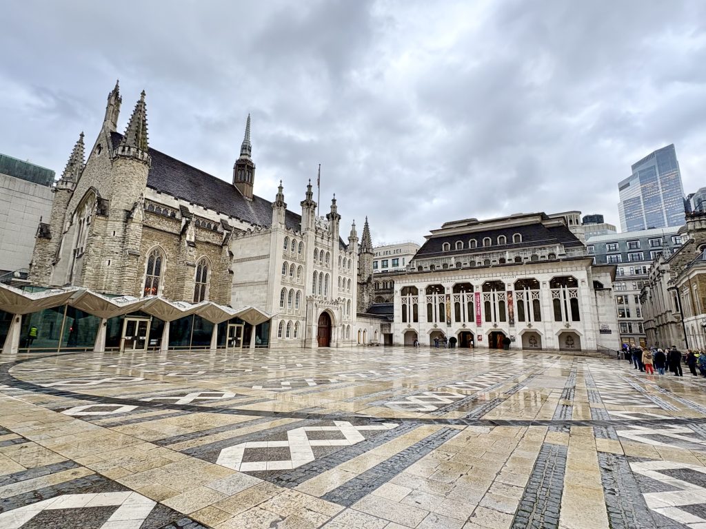 Detta lilla men otroligt vackra konstmuseum är byggnaden med flaggorna på bilden. Huset bredvid är historiska Guild Hall och den svarta ringen markerar var Londoniums arena från romartiden låg. Bara detta är anledning nog att besöka platsen.